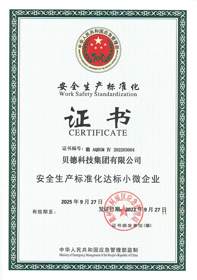 近日,貝德科技集團順利通過評審,獲得安全生產標準化達標小微企業”證書,這標志著公司的安全生產規范化、制度化、科學化等各項管理水平邁上了新的臺階。